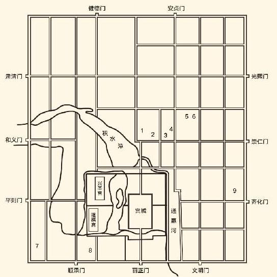 据陈高华著《元大都》绘。1 大天寿万宁寺;2 倒钞库;3 巡警二院;4 大都路总管府;5 国子监;6 孔庙;7 城隍庙;8 大庆寿寺;9 太庙
